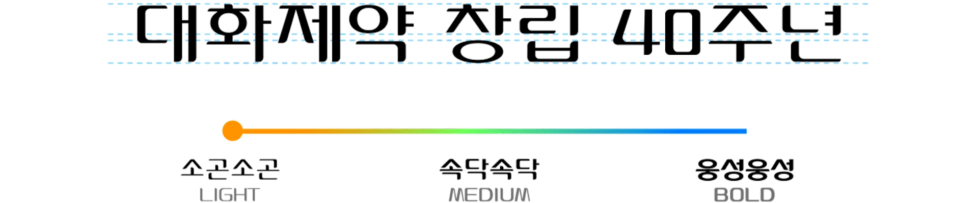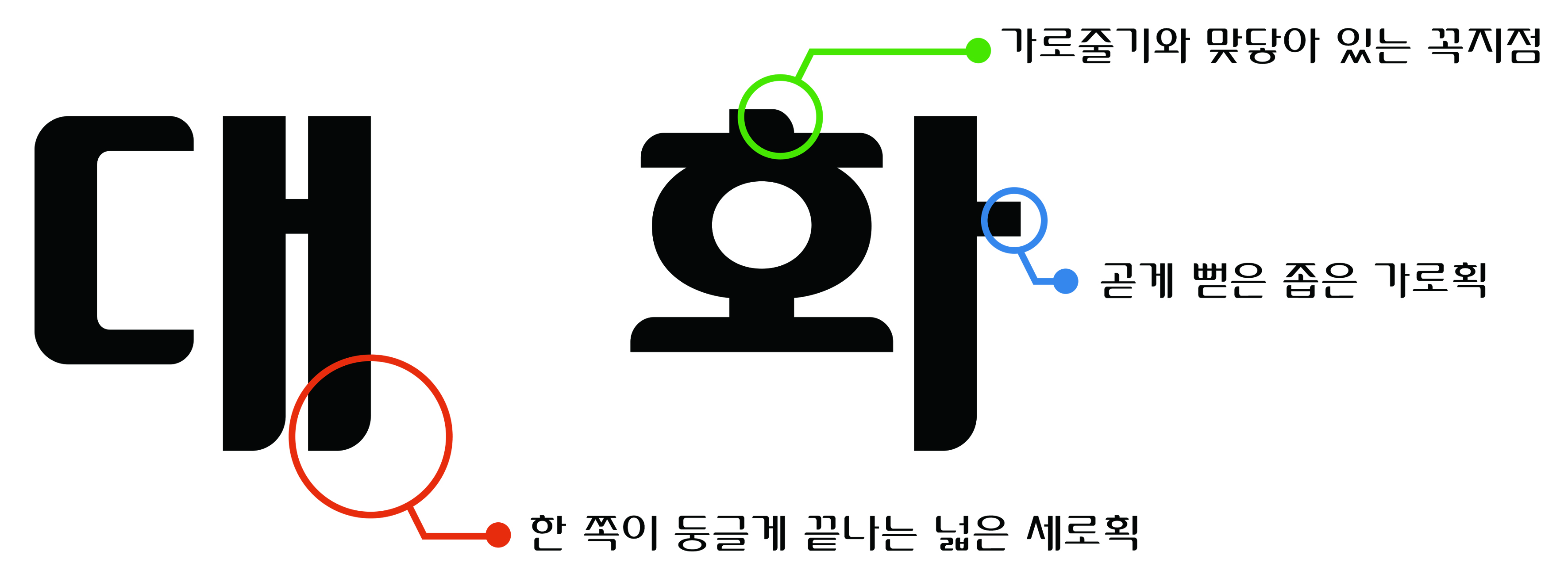 대화나눔의 소리는 제목용 글꼴 서체입니다. 대화제약 로고의 둥근 기둥, 가로줄기와 맞닿아 있는 꼭짓점, 별다른 장식 없이 간결하게 끝나는 짧은 곁줄기들이 대화체의 일관적인 비주얼 모티프입니다.